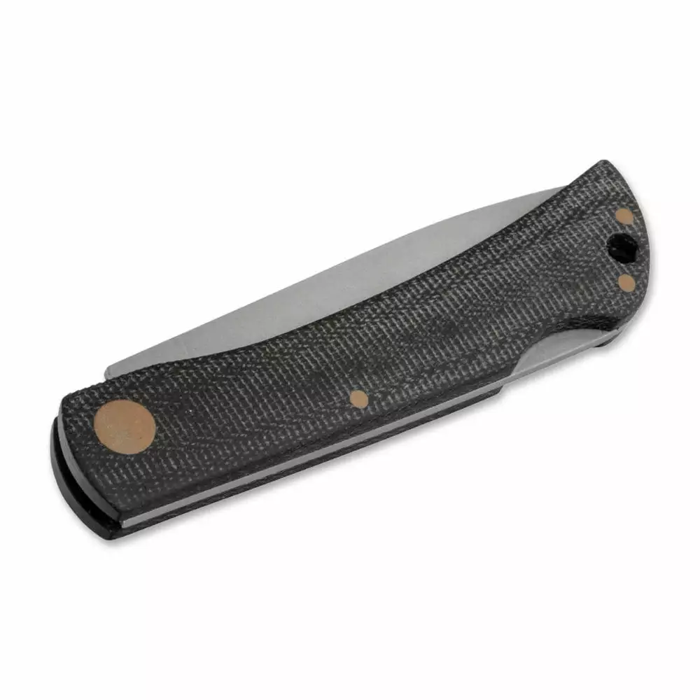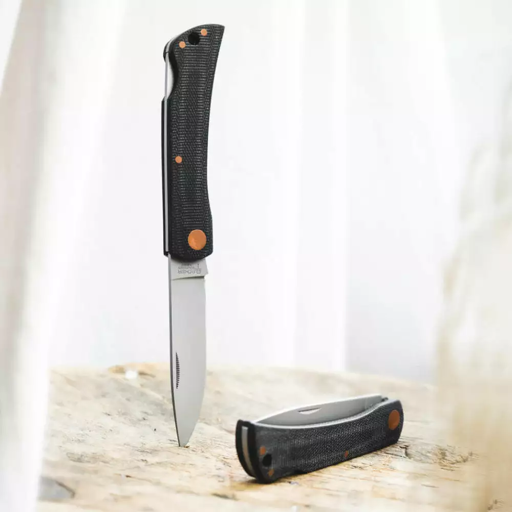 Then handle of the Rangebuster is black canvas Micarta with decorative brass rivets that make a bold statement. It is contoured ergonomically to make this knife extremely comfortable to hold – making it span from working knife to gentleman’s knife.