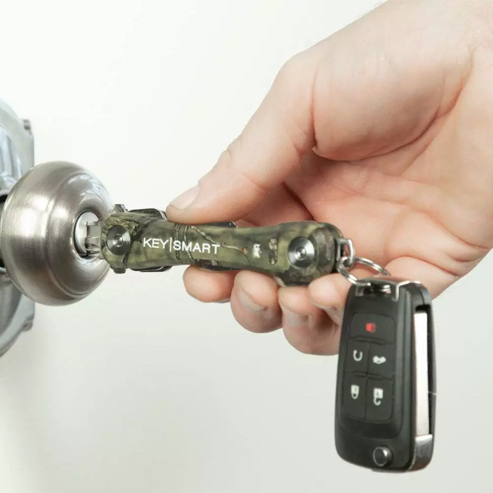 The KeySmart Pro Mossy Oak Camo Compact Key Holder with Tile Smart Location is a minimalist but tough key holder that tames your unruly tangle of keys and lets you keep tabs on them. Load 1 to 14 keys into the KeySmart Pro, and eliminate bulky, noisy, sharp keys. Quickly and easily pull out just the key you need.