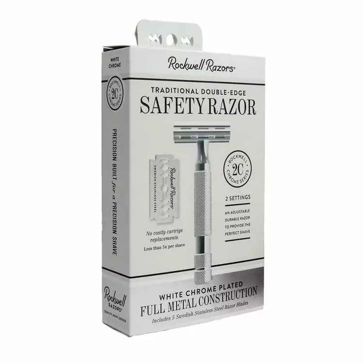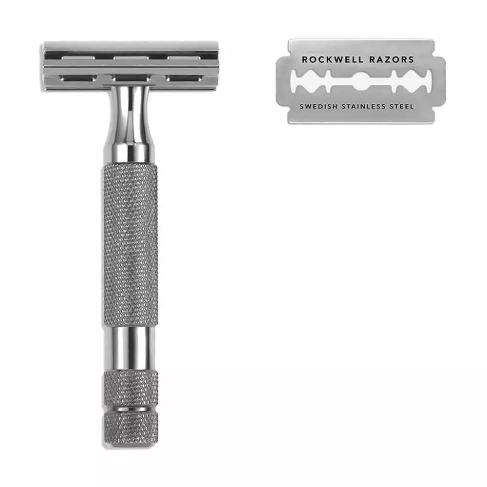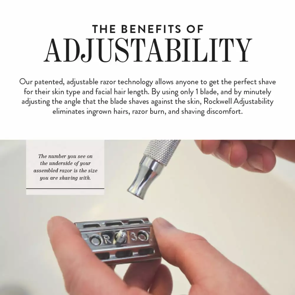 1 Rockwell 2C Double Edge Razor, 1 Patented Flippable Base Plats for 2 Levels of Adjustability, and 5 Rockwell Swedish Stainless Steel Razor Blades