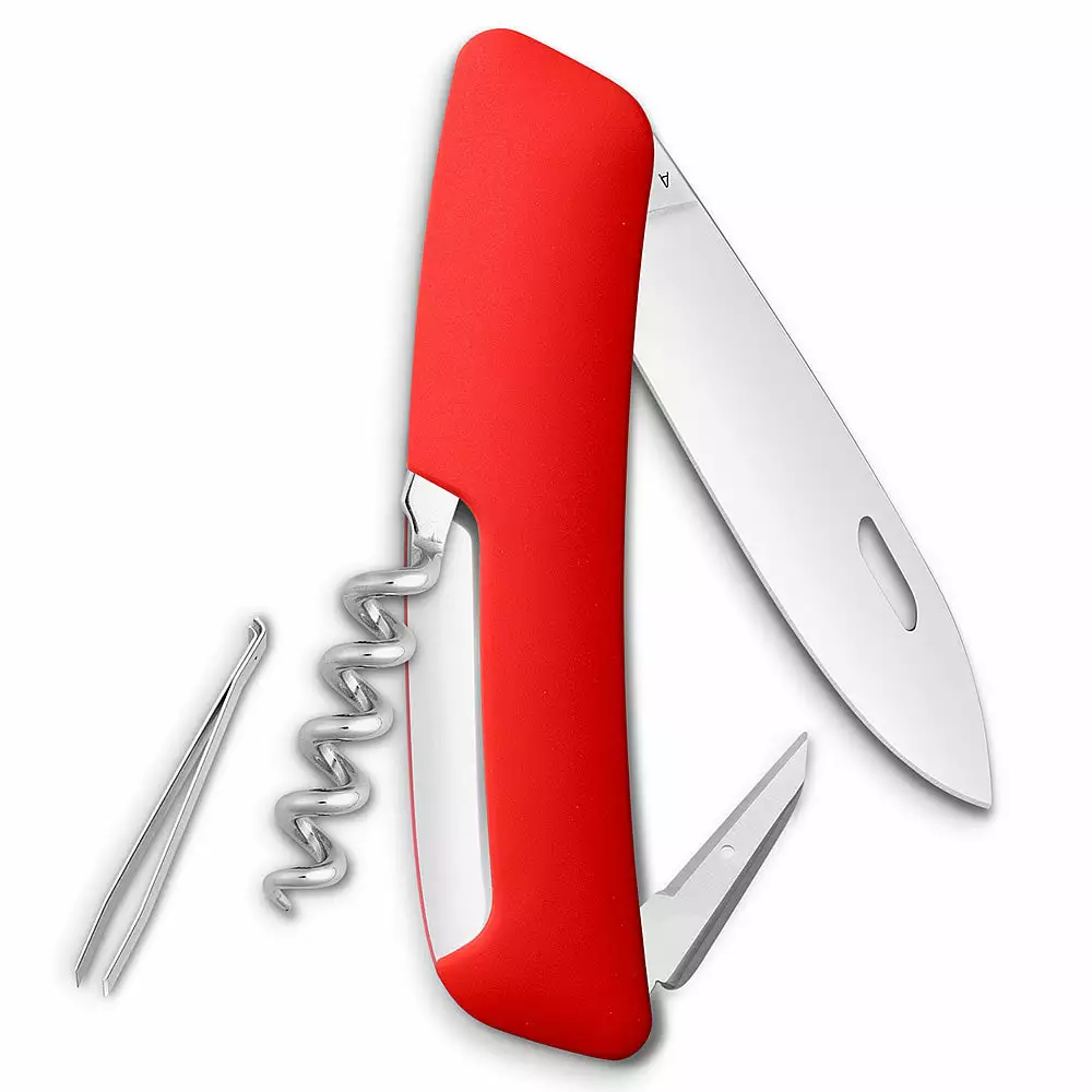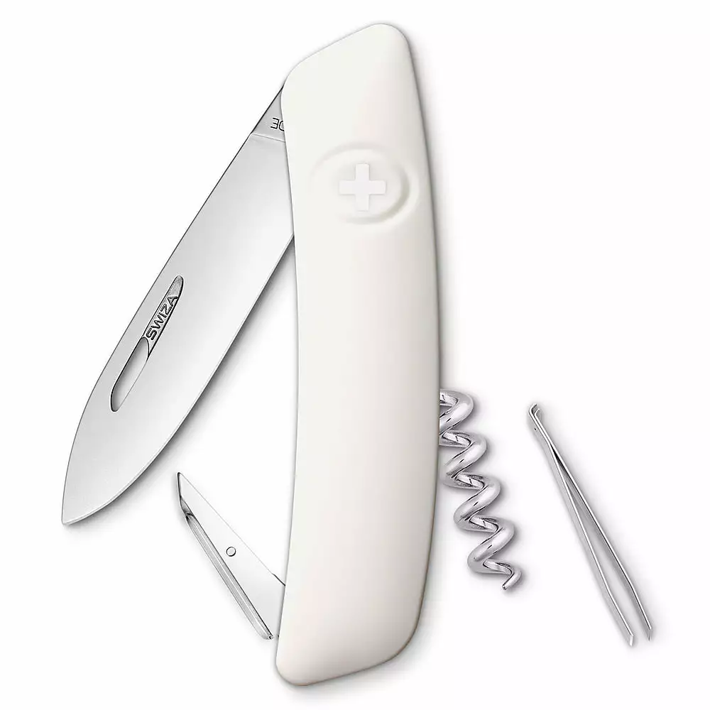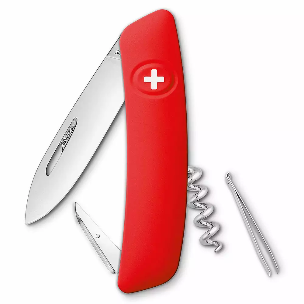 The Swiza D01 Swiss Pocket Knife is an authentic Swiss Knife with a unique new design. The D01 features a long (2.95 inch), strong, locking stainless steel blade and 3 other implements housed in ergonomic, soft-touch handles. The blade’s die-cut slot makes it easy to open with either your left or right hand, and the Swiza Swiss cross logo on the handle is a safe, convenient blade lock release.