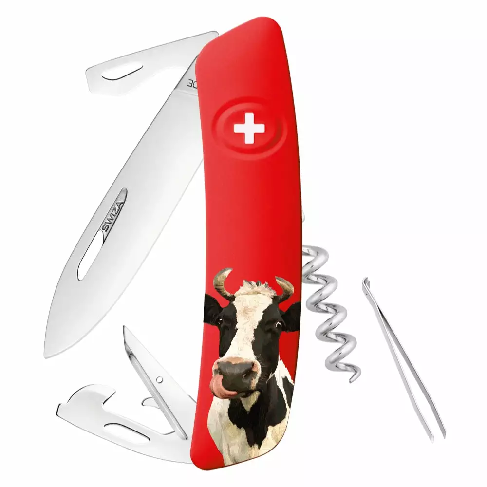 The Swiza D03 Marguerite Cow Swiss Pocket Knife features the image of a content Swiss dairy cow named “Marguerite,” or “Daisy,” on the front and a solid red back.