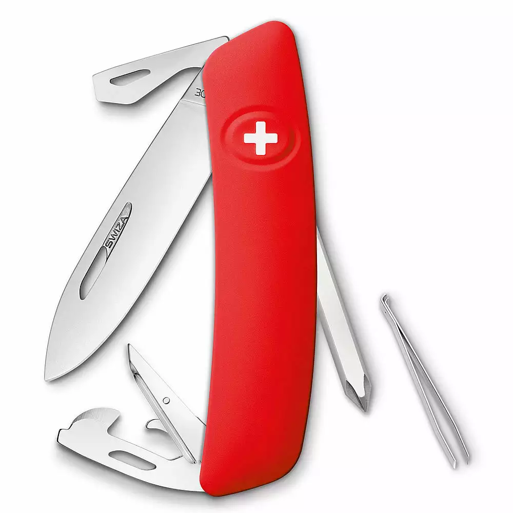 The Swiza D04 Swiss Pocket Knife is an authentic Swiss Knife with a unique new design. The D04 features a long (2.95 inch), strong, locking stainless steel blade and 5 other implements housed in ergonomic, soft-touch handles. The blade’s die-cut slot makes it easy to open with either your left or right hand, and the Swiza Swiss cross logo on the handle is a safe, convenient blade lock release.