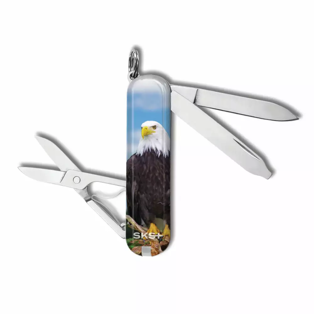 The Bald Eagle Classic SD Swiss Army Knife by Victorinox is a striking Swiss Knife Shop Design Studio pocket tool that features a majestic Bald Eagle on both sides. On the back of this knife, along with America’s national bird, is a small SKS logo, as this knife was created by our SKS Design Studio.