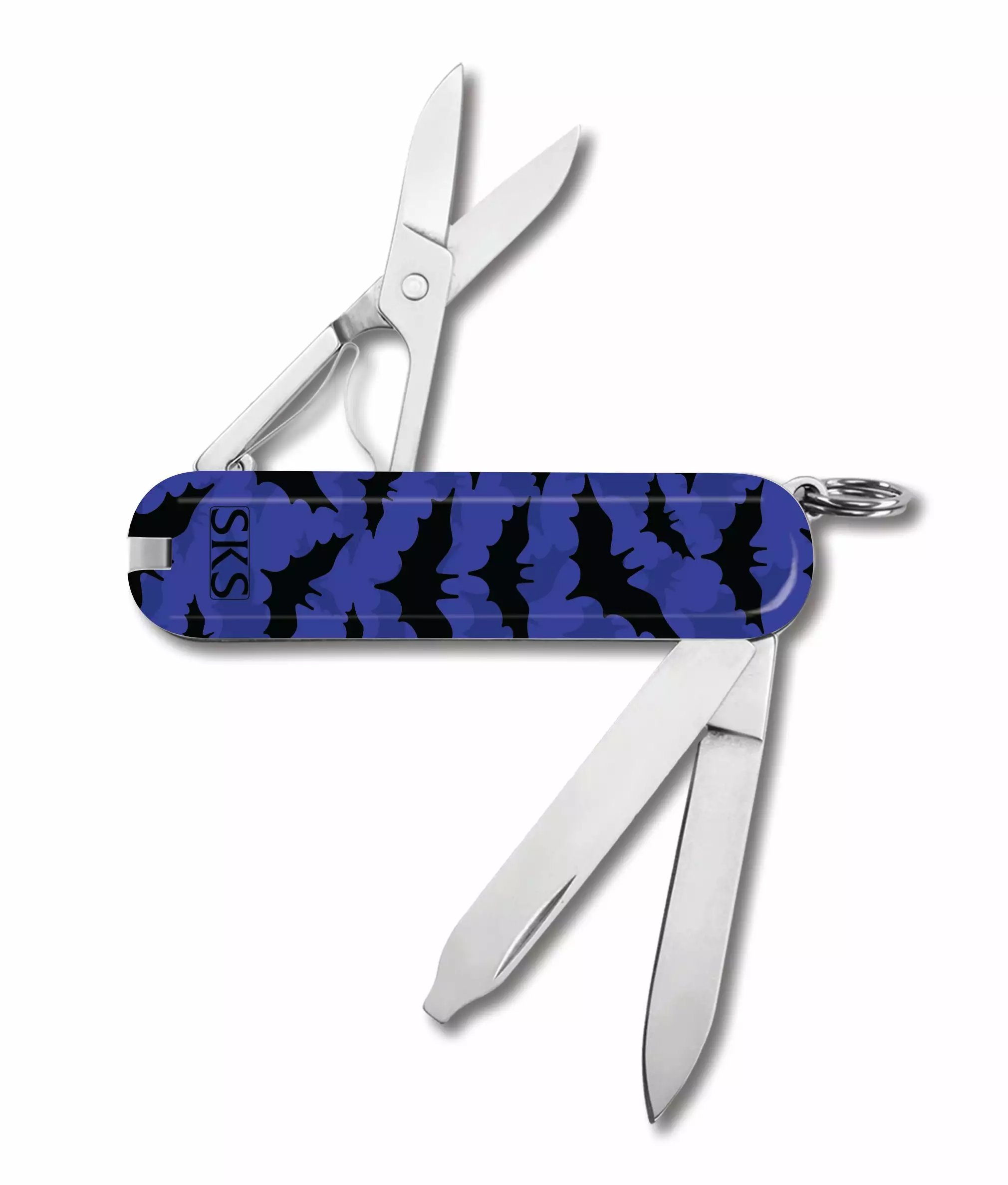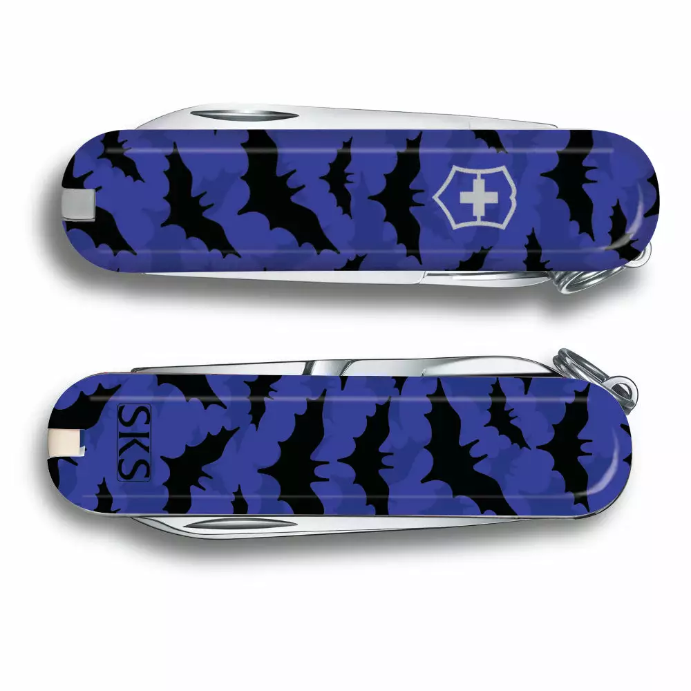 The Bats Classic SD Swiss Army Knife by Victorinox is a spooky Swiss Knife Shop Design Studio pocket knife featuring a subtle blue and black graphic bat pattern. There is a small SKS logo on the back, as this knife was created by our SKS Design Studio.