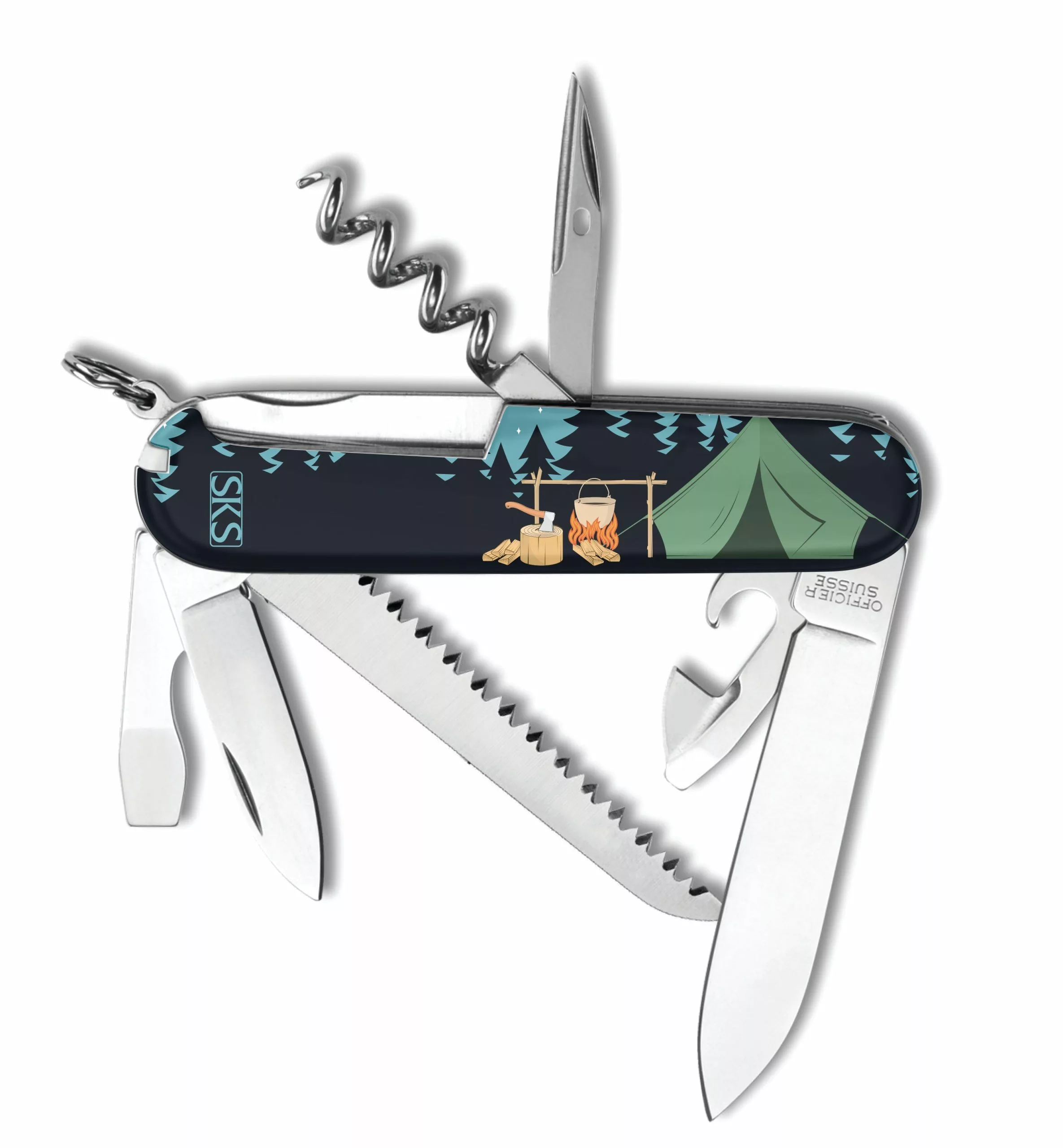 On the back of this knife, a tent awaits him after he finishes his s’mores. There is a small SKS logo on the back, as this knife was created by our SKS Design Studio.