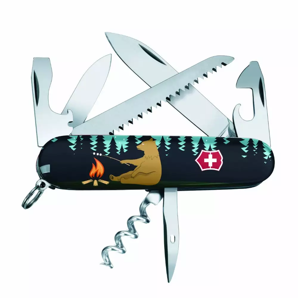 The Bear Necessities Camper Swiss Army Knife by Victorinox is a whimsical Swiss Knife Shop exclusive that features a happy bear roasting marshmallows over a campfire on the side with the cross and shield.