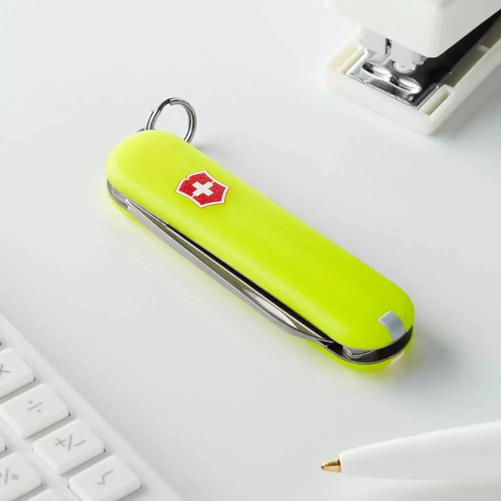 The Classic SD Swiss Army Knife by Victorinox has a cool new look. This unique Classic StayGlow is based on the Classic SD pocket multi-tool. What makes StayGlow so special? The grip shells are fluorescent and glow-in-the-dark. That makes it possible to find your Classic any time at any place. The fluorescent material has been tested and is absolutely safe.