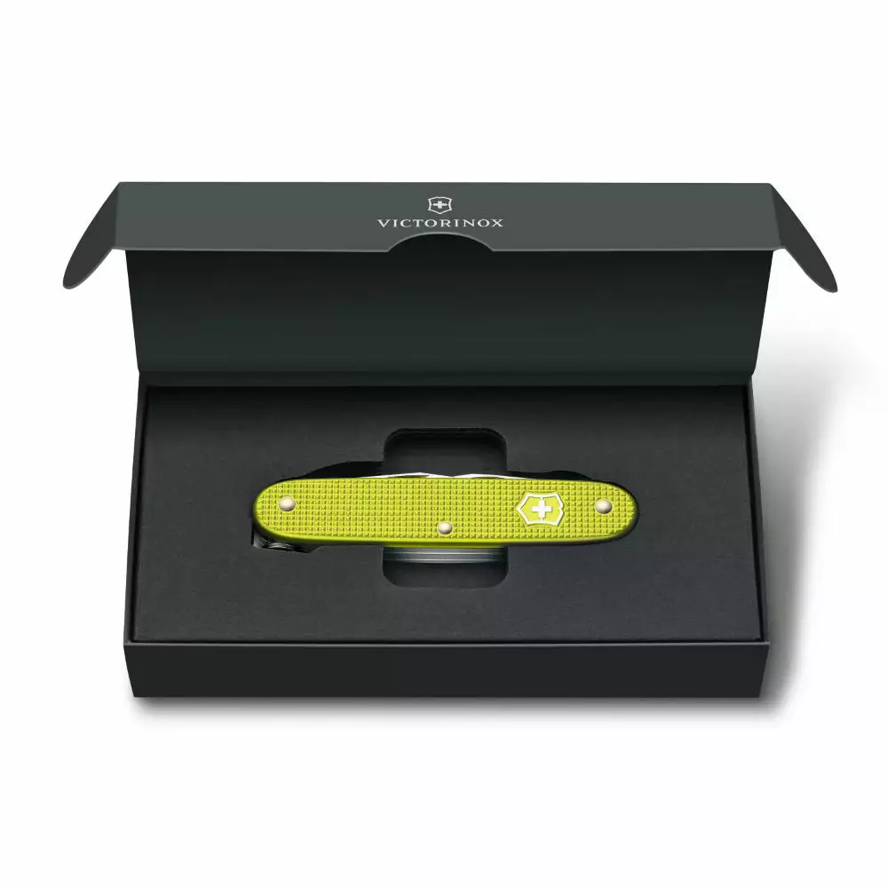 This bold, bright electric yellow-colored Pioneer X has Alox handles, which are punched from aluminum, embossed, anodized and coated with a protective layer to keep them safe from the effects of use and corrosion. The back panel of this limited edition Pioneer X is engraved with the year, 2023, and the tool is housed in a handsome presentation gift box featuring the Victorinox logo.