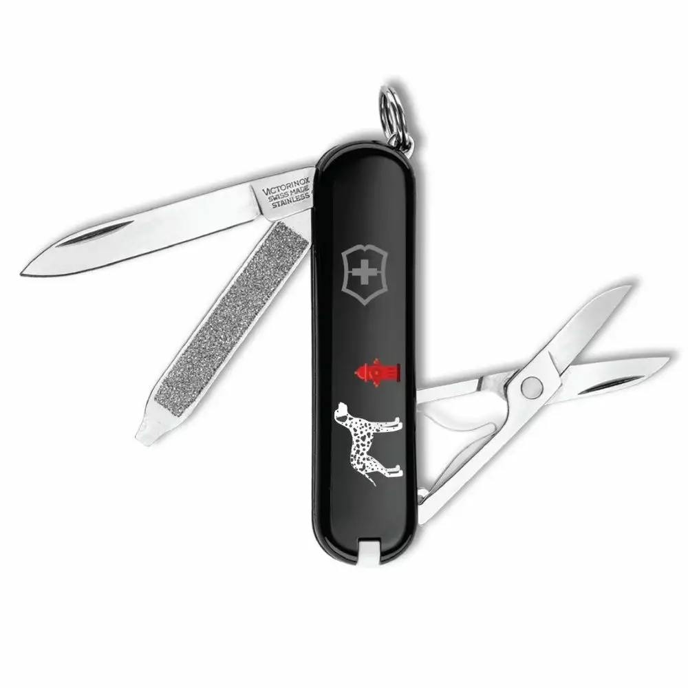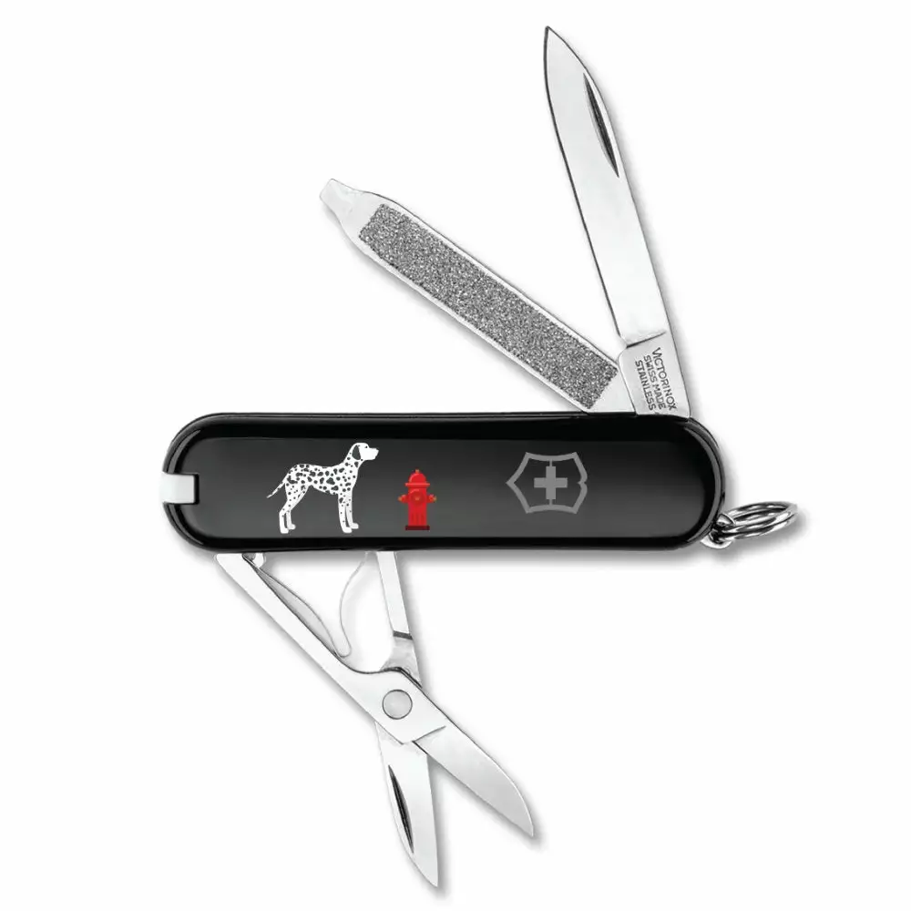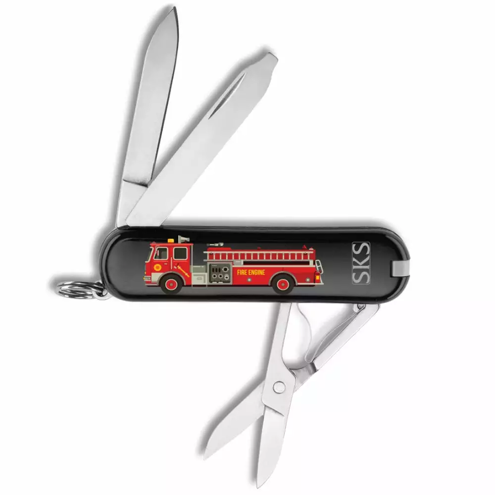 The Fire Truck Classic SD Swiss Army Knife by Victorinox is a unique Swiss Knife Shop design that features a bright red truck on one side, and a Dalmatian near a fire hydrant on the other. There is a small SKS logo on the back, as this knife was created by our SKS Design Studio.