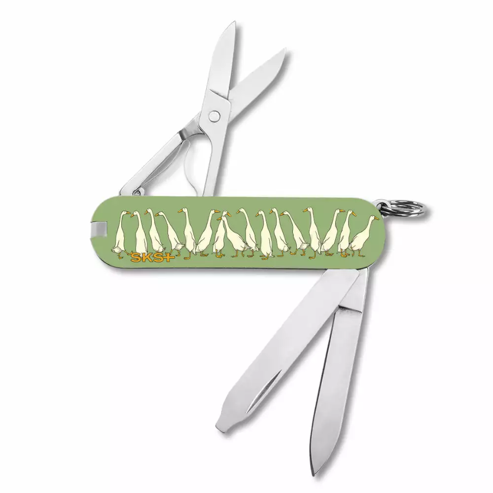 The Gaggle of Geese Classic SD Swiss Army Knife by Victorinox is a Swiss Knife Shop Design Studio creation featuring an adorable lineup of geese. The back of this Swiss knife has the SKS logo, as this keychain tool is our own design.