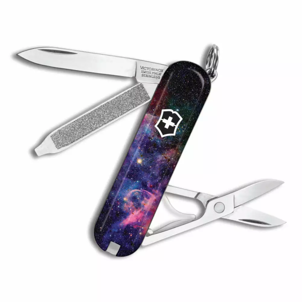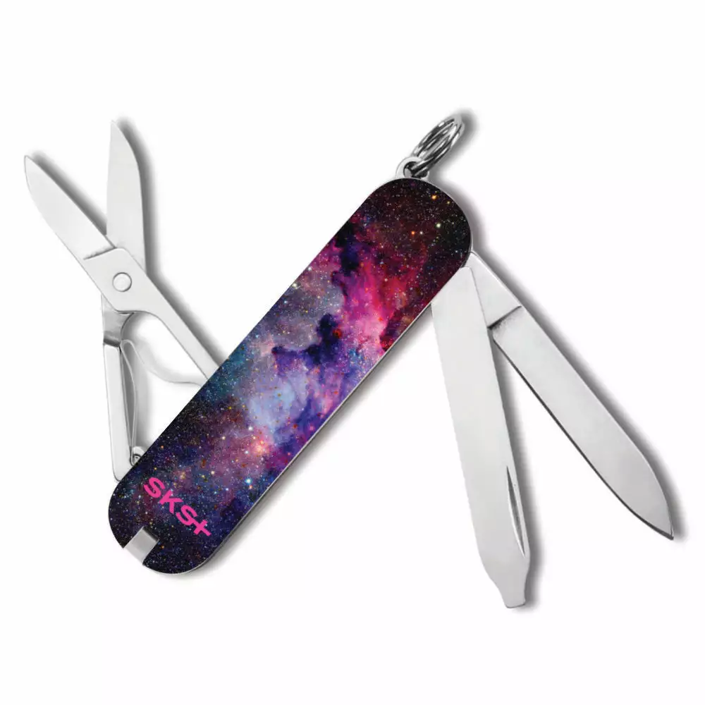 The Galaxy Classic SD Swiss Army Knife by Victorinox is a Swiss Knife Shop Design Studio creation. This beautiful Classic SD features a stunning shot of a nebula and galaxies in space. There is a small SKS logo on the back, as this knife was created by our SKS Design Studio.