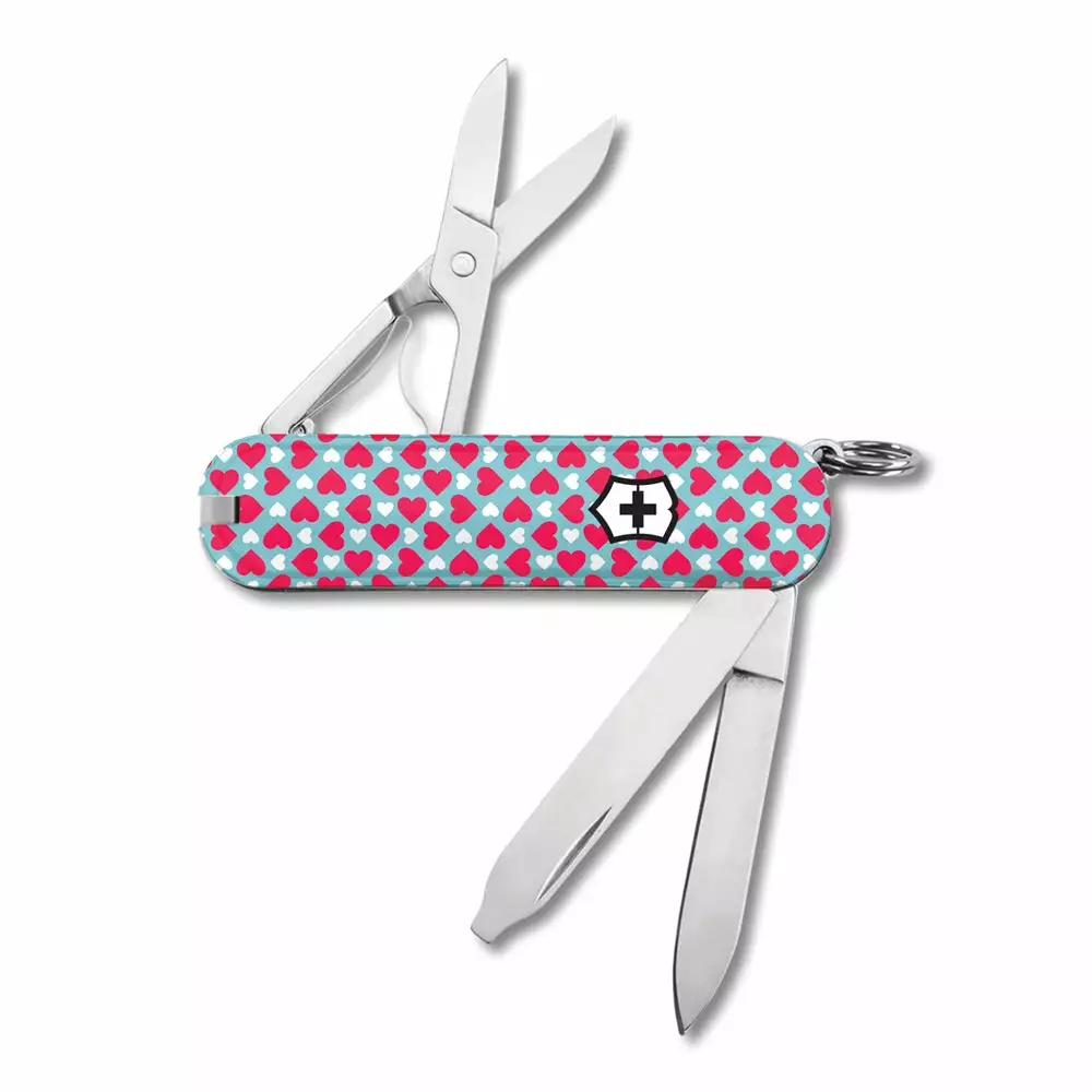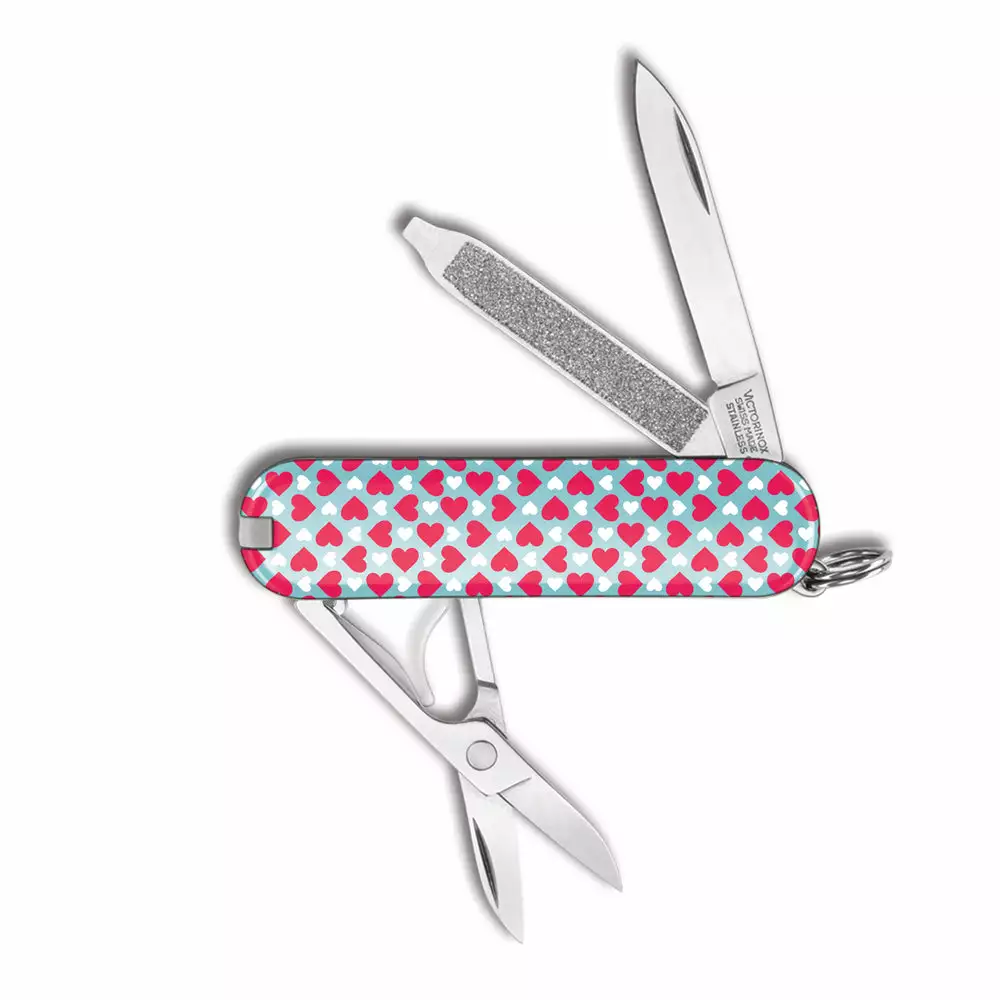 The Hearts All Around Classic SD Limited Edition Swiss Army Knife by Victorinox is a Swiss Knife Shop Design Studio creation with a colorful heart pattern ideal for giving to your loved ones.
