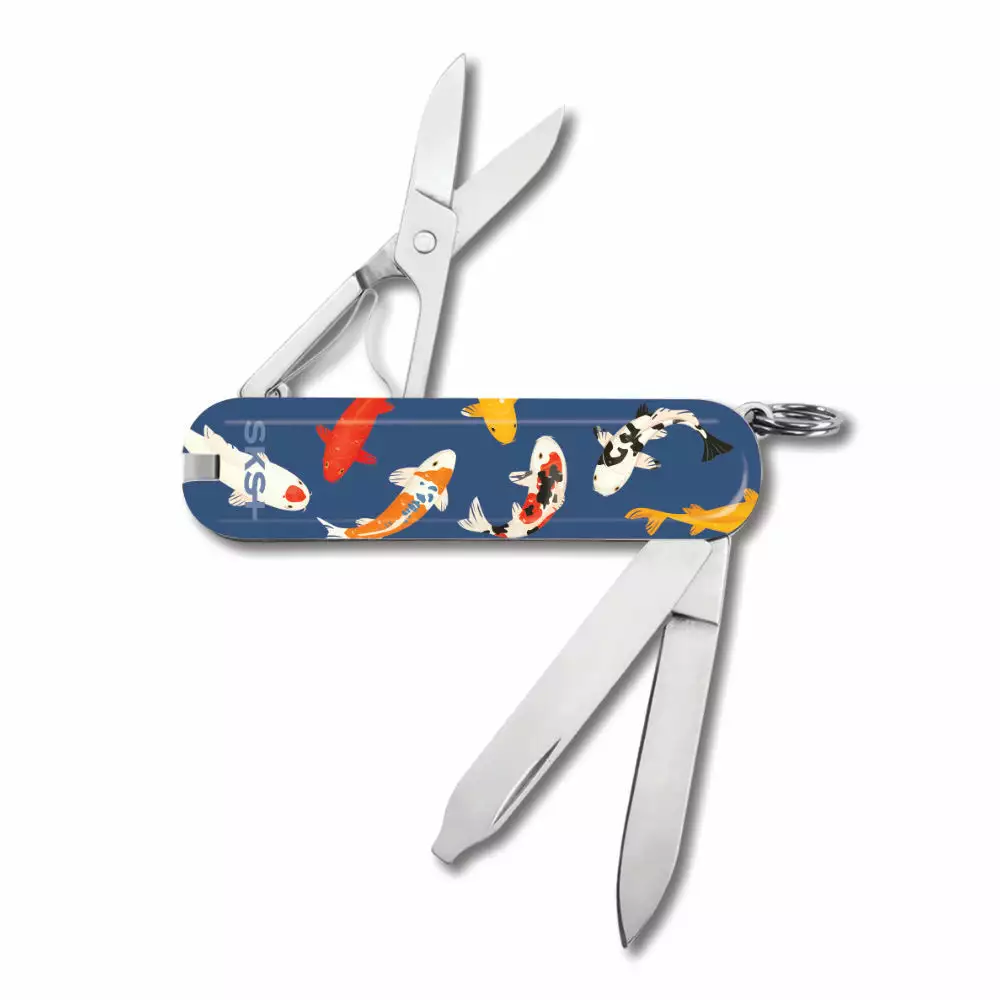 The Koi Fish Classic SD Swiss Army Knife by Victorinox is a Swiss Knife Shop Design Studio creation featuring a colorful pond of koi fish, with one large orange and white fish on one side, and a school of koi on the opposite side. There is a small SKS logo on the back, as this knife was created by our SKS Design Studio.