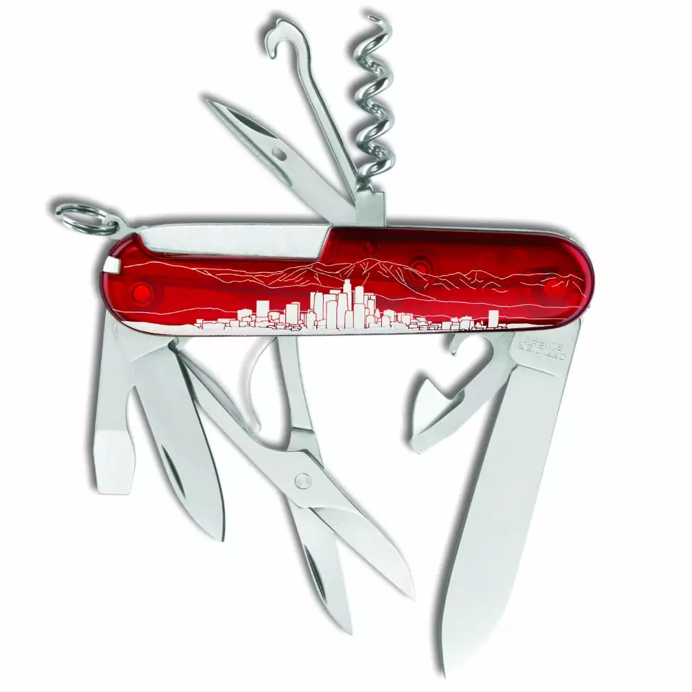 The Los Angeles Skyline Climber Swiss Army Knife by Victorinox is a very limited edition produced in small quantities for Victorinox stores. Swiss Knife Shop has a few of these collectors’ items available for a limited time. This striking knife features the silhouette of LA’s cityscape and mountains on one side, and the coordinates of this famous city on the other.