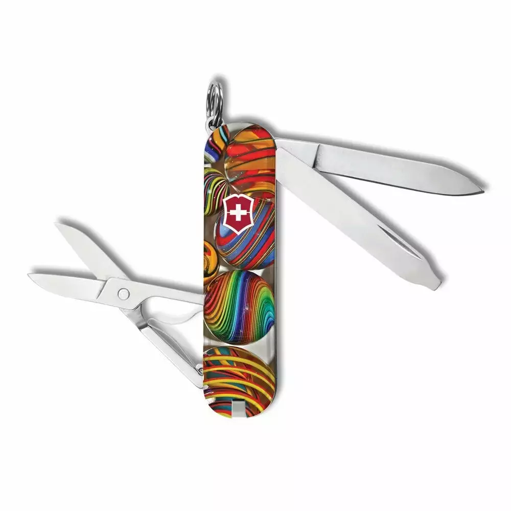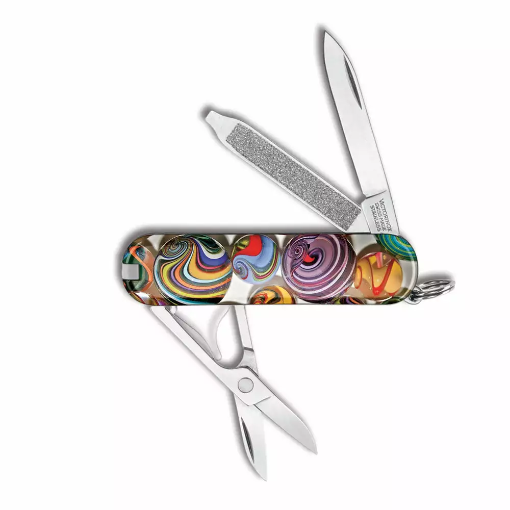 The Marbles Classic SD Swiss Army Knife by Victorinox is a Swiss Knife Shop Design Studio creation showcasing the beautiful, colorful hand crafted marbles of Fritz Glass on Cape Cod. A photo of Fritz’s bright, swirling marbles is printed on a genuine Swiss Army Knife.