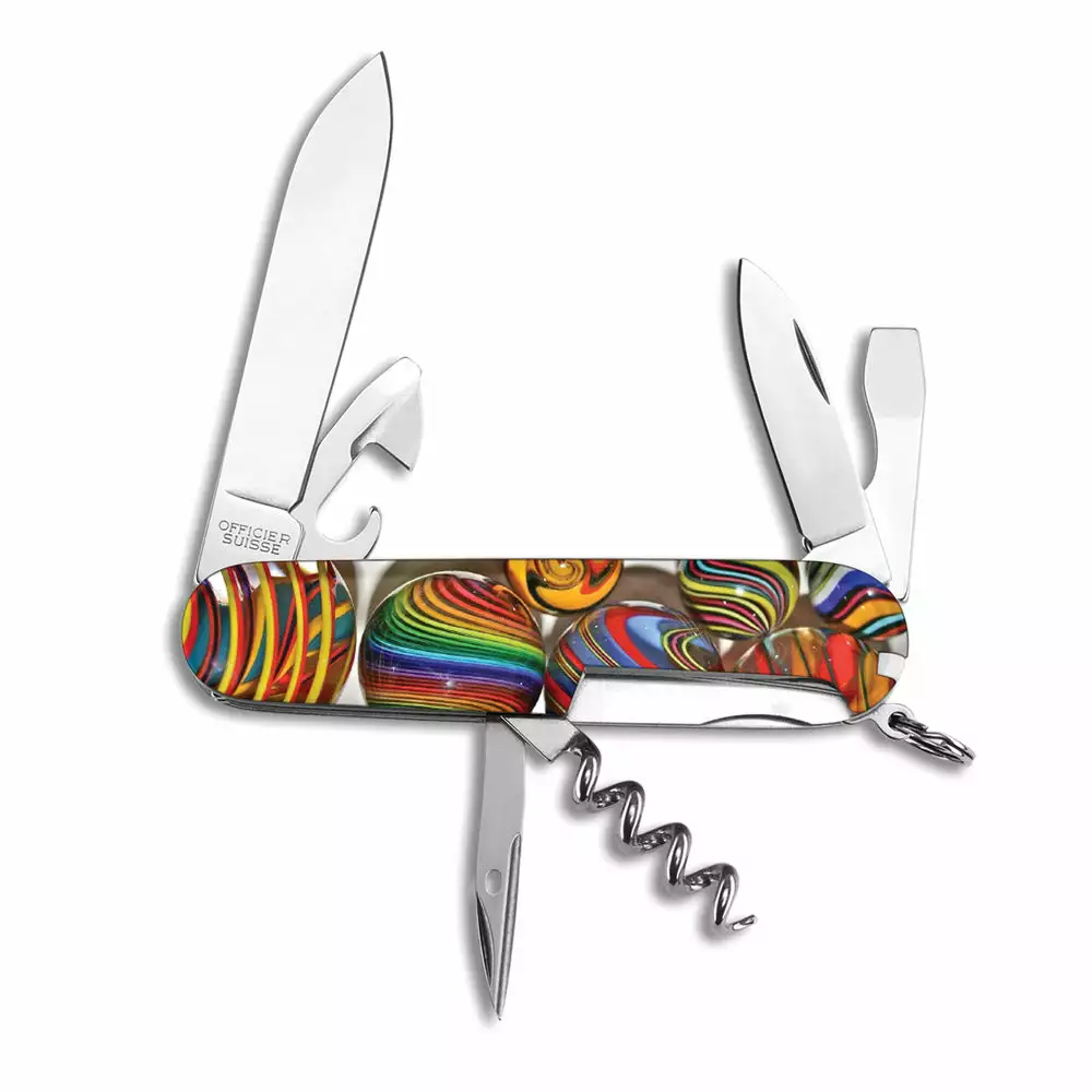 Exclusive to Swiss Knife Shop, the Marbles Spartan Swiss Army Knife by Victorinox showcases the beautiful, colorful hand crafted marbles of Fritz Glass on Cape Cod while providing the power of the Spartan Victorinox Swiss Army multi-tool. A photo of Fritz’s stunning marbles is printed on the handles of this genuine Swiss Army Knife.