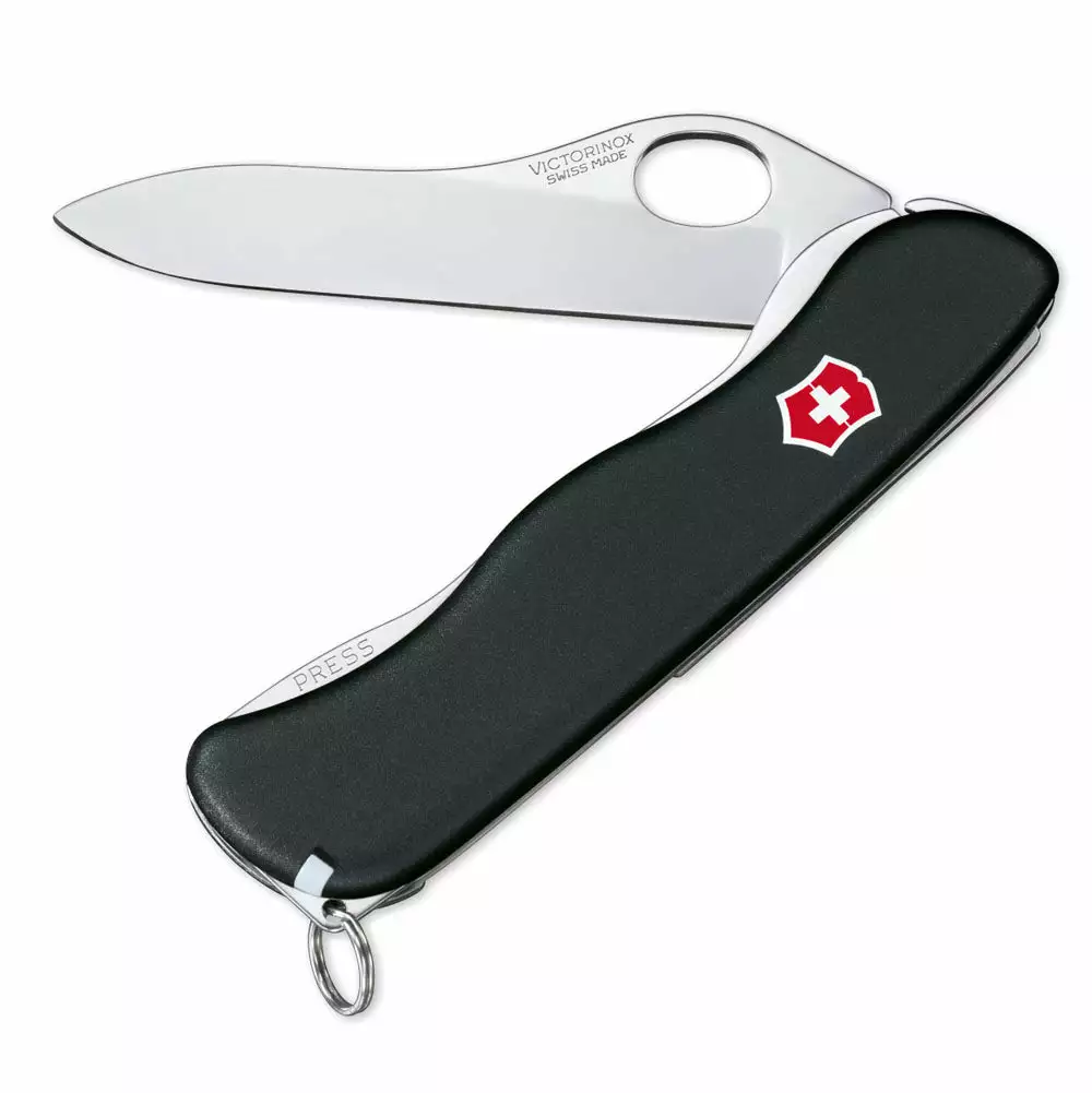 The One-Hand Sentinel Non-Serrated Swiss Army Knife by Victorinox offers a slim design and an economical price. This lockblade, featuring a single one-hand non-serrated blade, allows for easy, smooth one-hand operation.