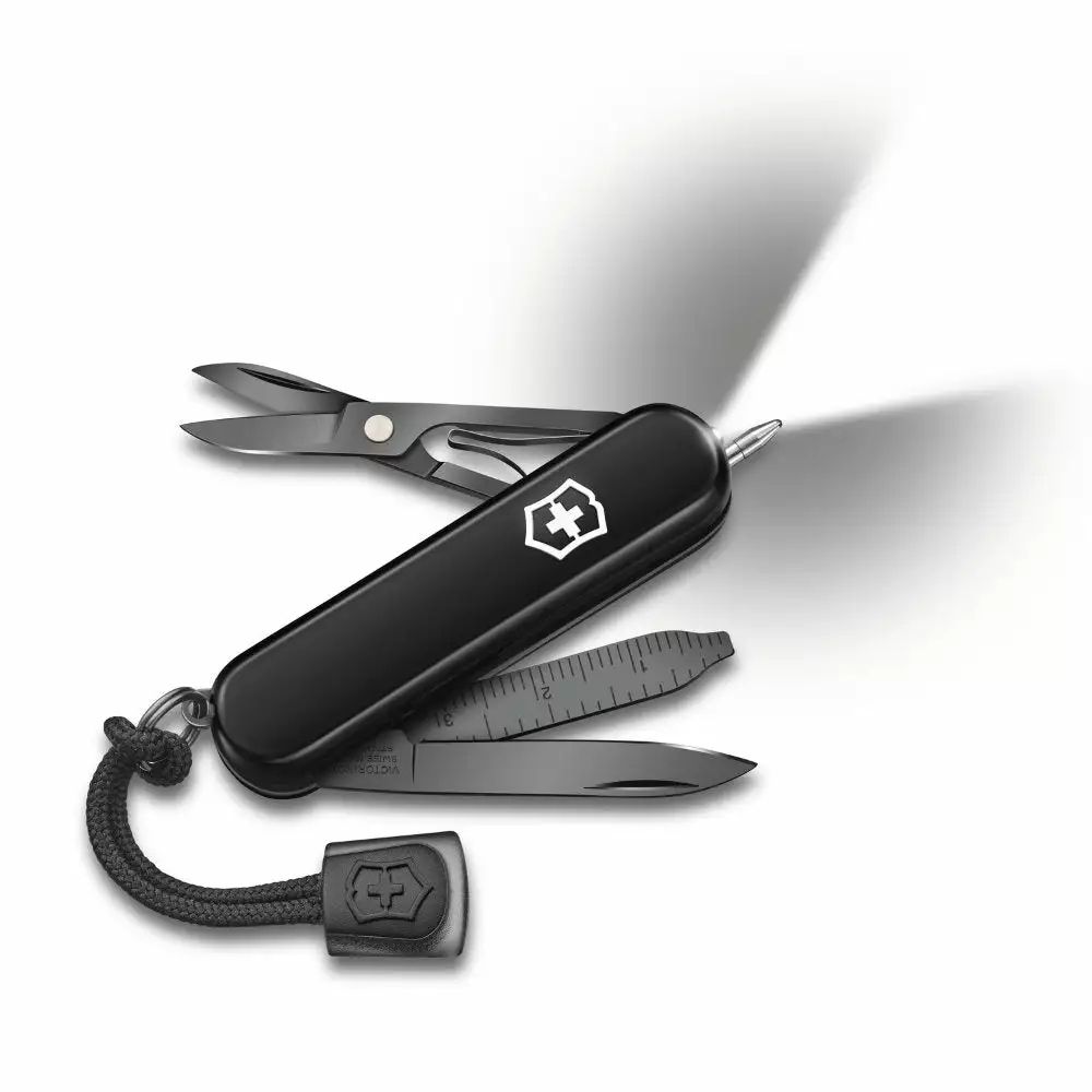 The Onyx Black Signature Lite Swiss Army Knife by Victorinox is a sleek, monochromatic version of a Victorinox bestseller. This bold Onyx Black knife features tools with a stunning polispectral coating of chromium oxide, resulting in a smooth, glossy black with the durability for serious use. Black handles and a black lanyard complete this bold Signature Lite.