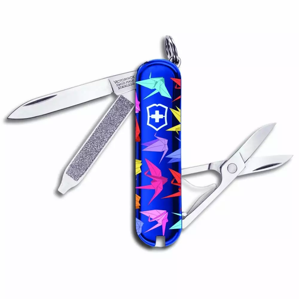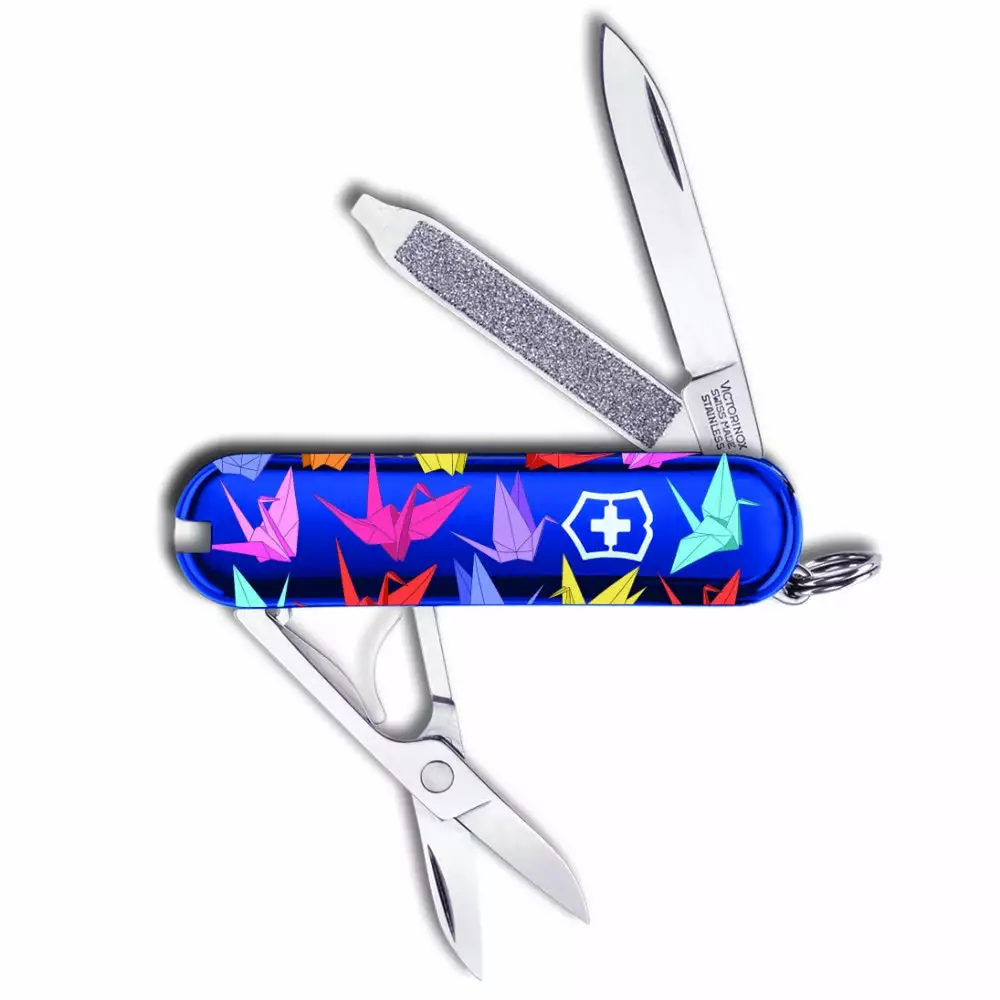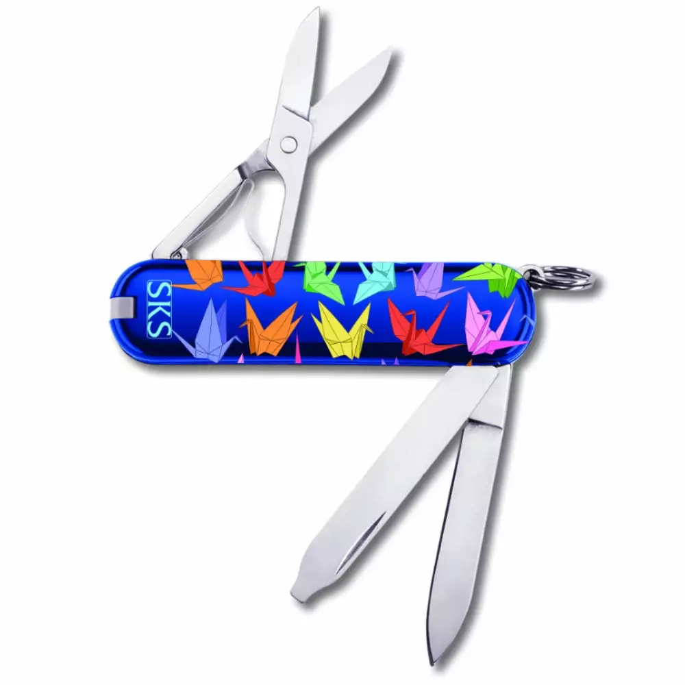 The Origami Classic SD Swiss Army Knife by Victorinox is a Swiss Knife Shop Design Studio creation featuring a multitude of colorful origami cranes. The crane is the most well-known origami model in Japan, where legend has it that anyone who folds 1,000 of these graceful birds will be granted a wish. There is a small SKS logo on the back, as this knife was created by our SKS Design Studio.