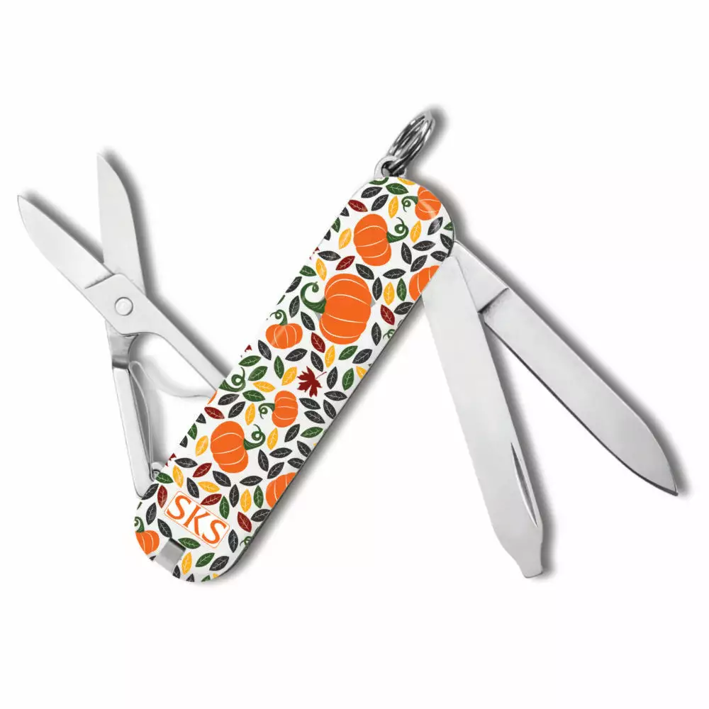 The Pumpkin Patch Classic SD Swiss Army Knife by Victorinox is a Swiss Knife Shop Design Studio creation celebrating autumn and all things pumpkin. This beautiful knife features a medley of bright orange pumpkins and colorful fall leaves. The back also has a small SKS logo, as this pattern is only available here.