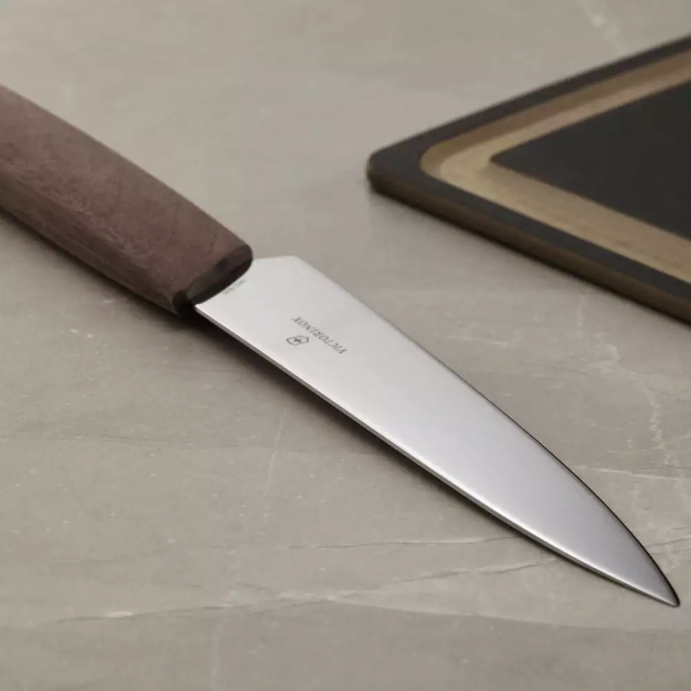 The Swiss Modern 6″ Chef’s Knife by Victorinox has a razor-sharp 6-inch blade that’s offers superior maneuverability, making it the knife of choice for precise cuts, as well as for larger tasks that benefit from the blade’s width.