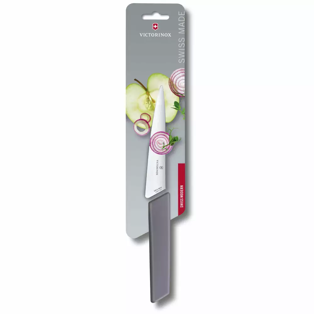Victorinox Swiss Modern knives have high carbon, stainless steel blades that are hand finished at Victorinox in Switzerland by skilled craftsmen. Each knife is stamped from a single sheet of metal. The blade is then hardened, tempered, ground, polished, etched and finished. Victorinox uses a special tempering process to produce an edge that can be resharpened over and over again. These blades are the same as those on the award-winning Fibrox Pro line by Victorinox.