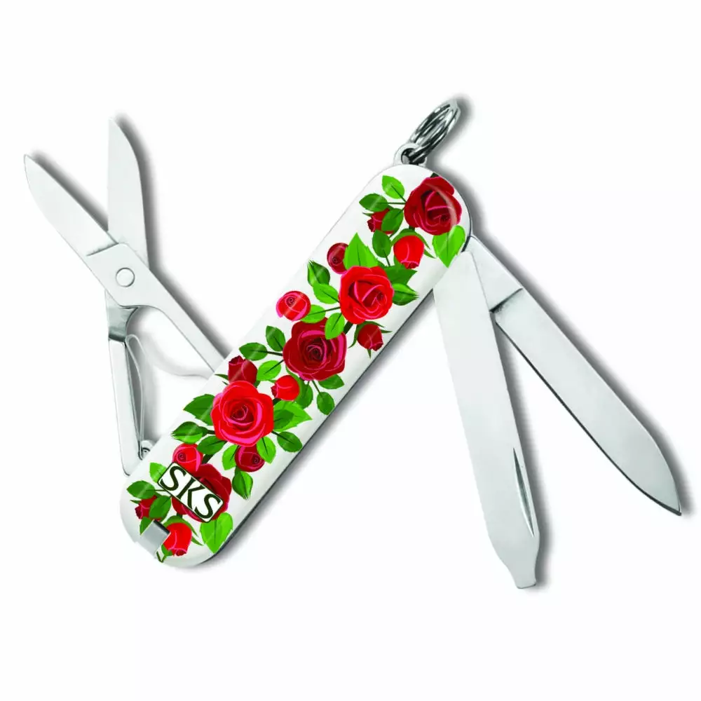 The Roses Classic SD Swiss Army Knife by Victorinox is a beautiful Swiss Knife Shop Design Studio creation that features a single red rose beneath the Victorinox Cross and Shield logo on one side, and a beautiful arrangement of many roses on the other. There is a small SKS logo on the back, as this knife was created by our SKS Design Studio.