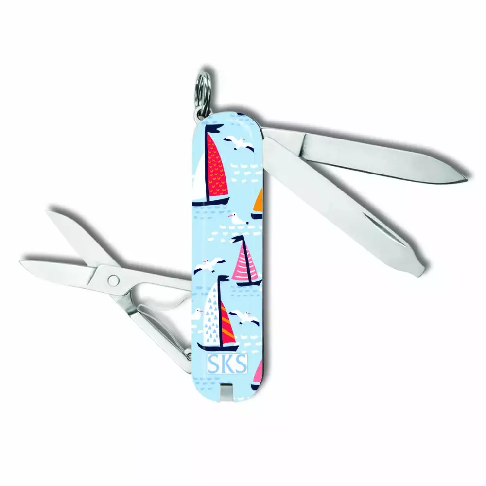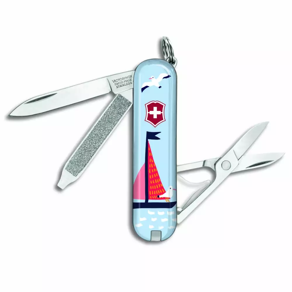 The Sail Away Classic SD Swiss Army Knife by Victorinox is a summery Swiss Knife Shop Design Studio creation covered with seagulls and colorful sailboats. On the side with the Victorinox logo is a single boat with a couple of gulls circling hopefully, and on the opposite side among the fleet of sailboats and birds is a small “SKS,” as this unique multi-tool was created here at Swiss Knife Shop.