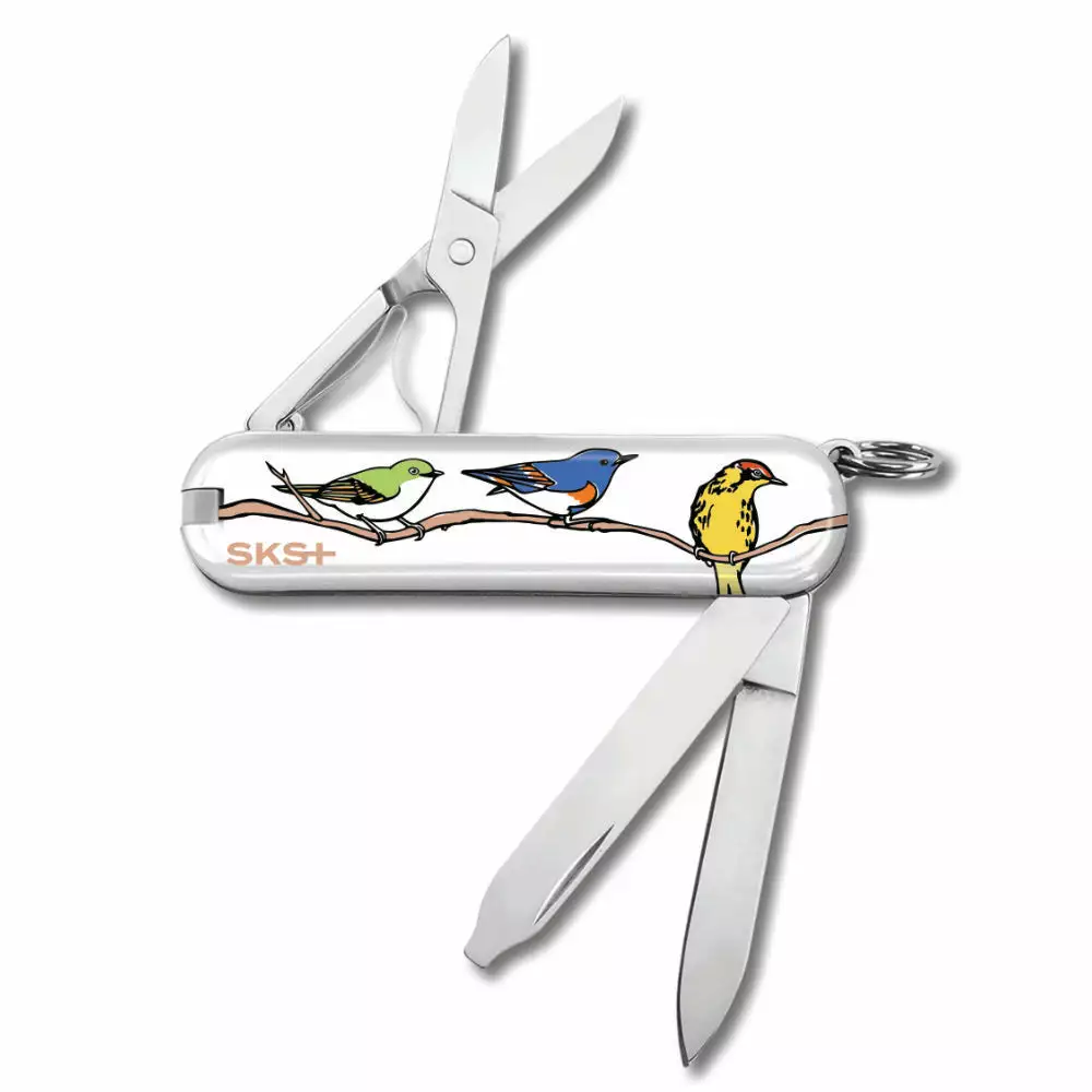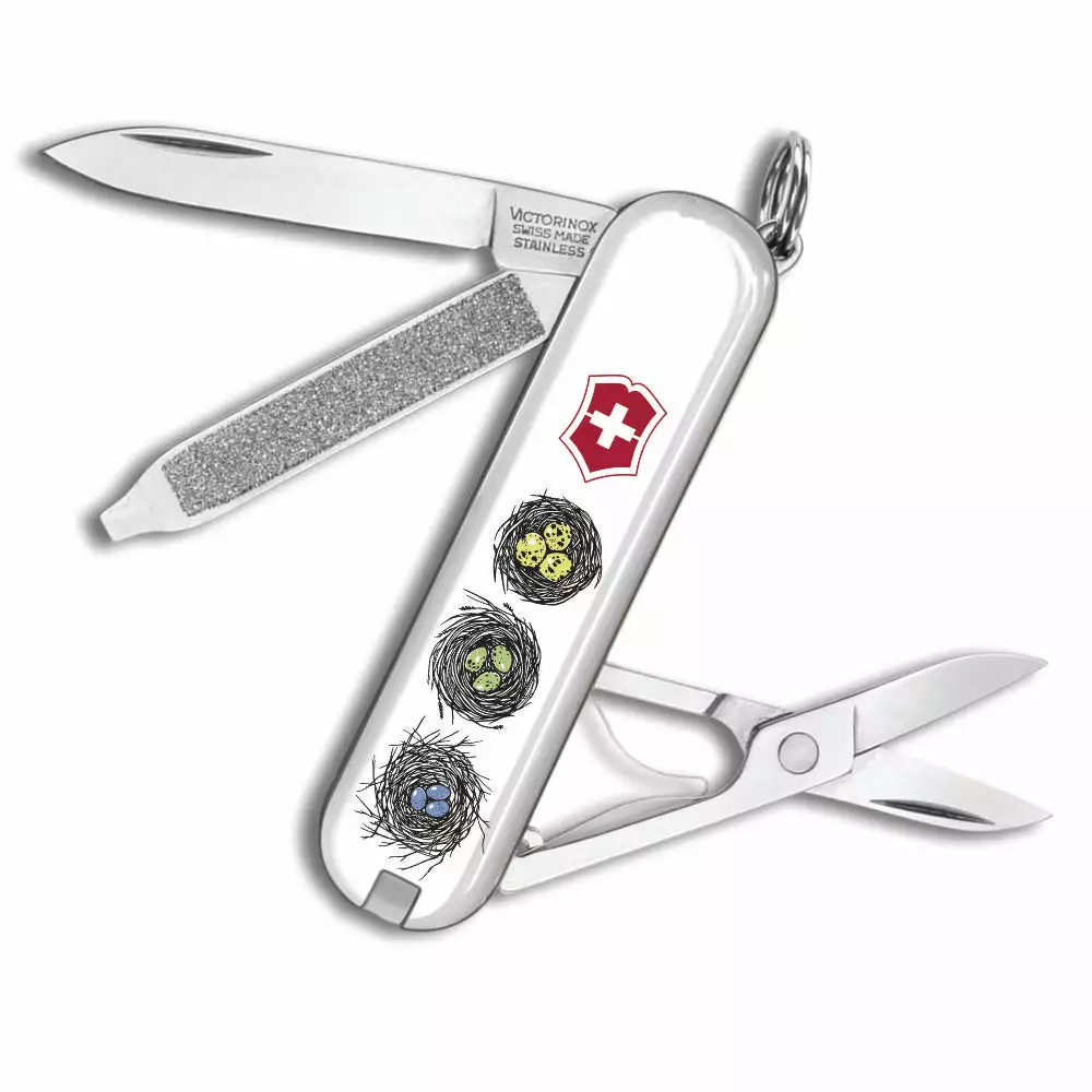 The Song Birds Classic SD Swiss Army Knife by Victorinox is a beautiful Swiss Knife Shop Design Studio creation that features three colorful song birds on one side, and their nests of colorful eggs on the other. On the back of this knife, beneath the birds’ branch, is a small “SKS,” as this unique multi-tool was created here at Swiss Knife Shop.