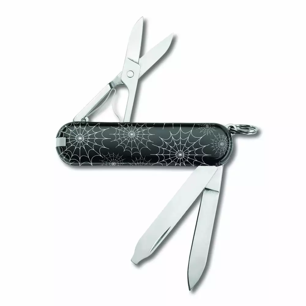 The Victorinox Spider Web Classic SD Swiss Army Knife is a Swiss Knife Shop exclusive draped with a delicate spider web pattern.