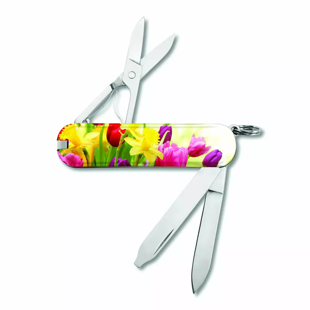 The Spring Flowers Classic SD Swiss Army Knife by Victorinox is a Swiss Knife Shop Design Studio creation celebrating the arrival of spring and all its beautiful flowers.