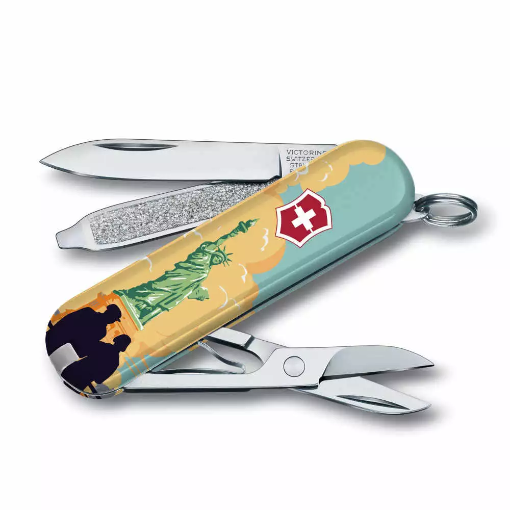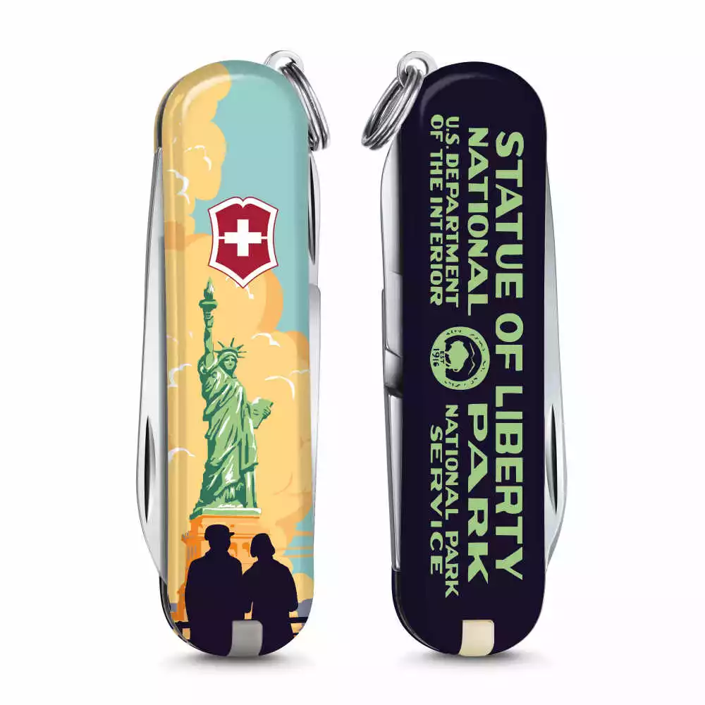 The Statue of Liberty National Park Poster Art Classic SD Swiss Army Knife by Victorinox is a special edition Classic SD features the artwork of Doug Leen, AKA “Ranger of the Lost Art,” who strives to educate people about the importance of nature conservation. A former Grand Teton National Park Ranger, Doug Leen created this unique silk-screen reproduction of the New Deal Era National Park poster for the Statue of Liberty.