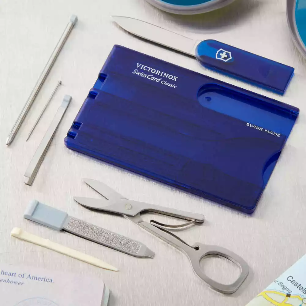 Victorinox’s innovative design team has combined the functionality of the pocketknife with the space-saving form of a credit card in the SwissCard Classic Swiss Army Knife. This slim multi-tool weighs in at just under one ounce, which makes it convenient to slip into your wallet, personal organizer, or purse. It packs in 10 often-used tools, including a pressurized ballpoint pen, small blade, scissors, tweezers, and more.