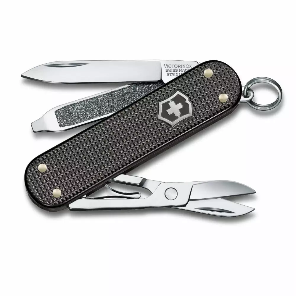 Engraving: Up to 6 characters can be custom laser engraved on the shield side of the Classic SD Thunder Gray Alox Swiss Army Knife in addition to 8 on both sides of the blade.