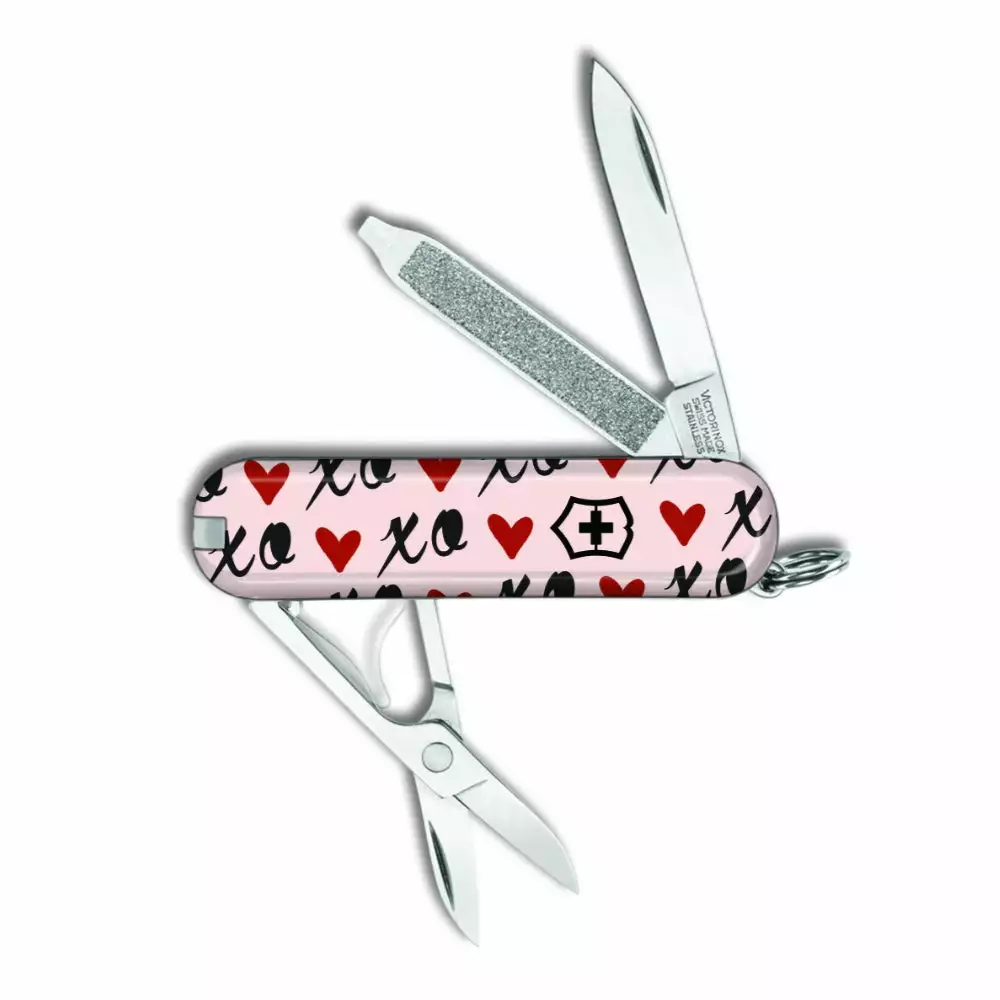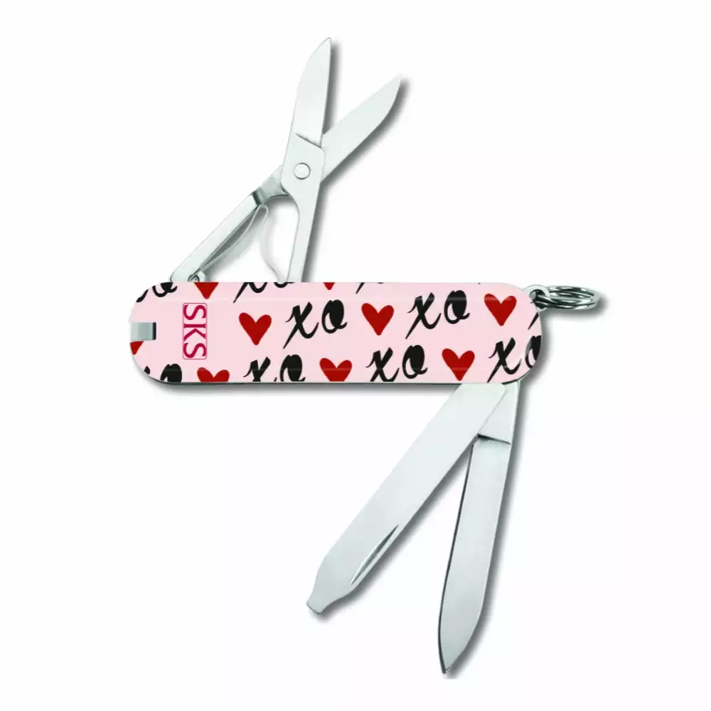 The XOXO Classic SD Swiss Army Knife by Victorinox is a Swiss Knife Shop Design Studio creation. This pale pink Classic SD features hearts, hugs and kisses, making it a great gift for your loved one – whether it be Valentine’s Day, a birthday, or any day you want to show your love. There is a small SKS logo on the back, as this knife was created by our SKS Design Studio.