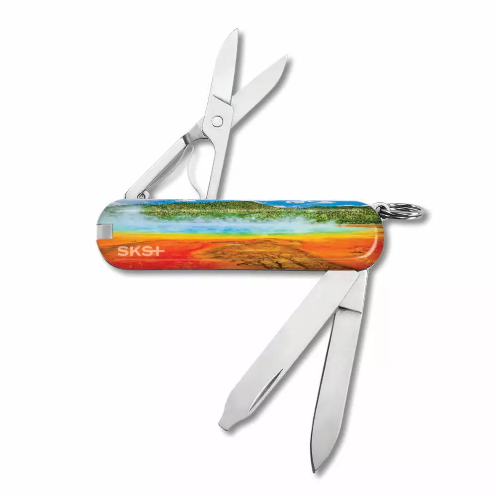 The Yellowstone Prismatic Lake Classic SD Swiss Army Knife by Victorinox is a Swiss Knife Shop Design Studio creation celebrating a beautiful landmark found in Yellowstone National Park. This awe inspiring hot spring and its vivid colors are just one of Yellowstone’s treasured features. There is a small SKS logo on the back, as this knife was created by our SKS Design Studio.